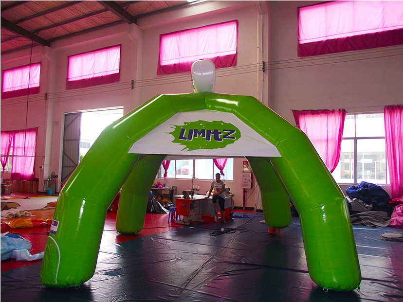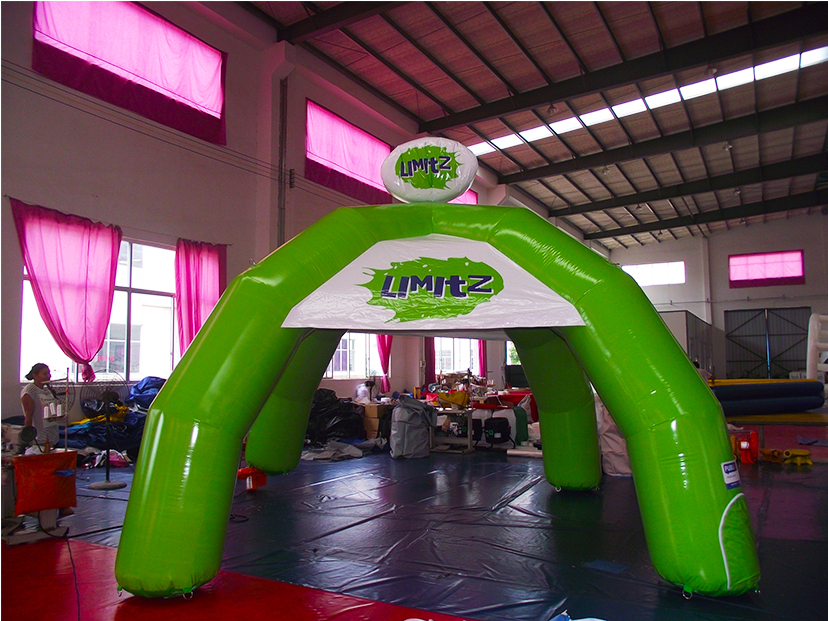 我们的充气品牌拱门采用高强度环保PVC夹网布材质,通过欧盟CE、美国ASTM等国际安全认证,具备优异的抗撕裂、抗紫外线与防水阻燃性能,可适应-20℃至50℃的各类户外与室内环境,无论是烈日下的马拉松赛事,还是微凉的品牌促销活动,都能稳定运行。独特的三柱弧形结构设计既保证了结构稳定性与开阔通行空间,又形成了极具辨识度的视觉造型;鲜亮的绿色主调搭配品牌专属印刷,让拱门在远距离即可形成强烈视觉记忆,有效提升品牌曝光与活动引导性。